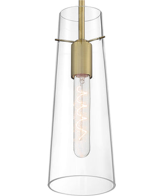 The 5"W Alondra 1-Light Pendant in Vintage Brass is a sophisticated lighting fixture that effortlessly combines modern design with timeless elegance. Featuring a sleek cylindrical shape, this pendant light showcases a clear glass shade that beautifully encases the bulb, creating a stunning visual effect. The vintage brass finish adds a touch of classic charm, making it a perfect addition to any contemporary or traditional decor.