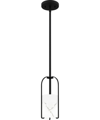 The Fairbanks Small 1-light Mini Pendant in Matte Black is a stunning addition to any home, combining modern elegance with a touch of luxury. Its sleek design features slender black lines that frame the alabaster glass shade, creating a sophisticated look that complements various interior styles. The matte black finish adds a contemporary edge, while the faux marble detailing on the shade brings a hint of opulence to the overall design.