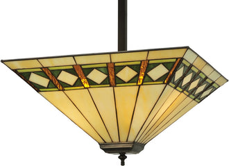 The 24"W Diamond Band Mission Inverted Pendant is a stunning addition to any space, blending timeless design with modern functionality. This pendant light is part of the Meyda Tiffany collection, known for its unique handcrafted artistry. Each piece is a masterpiece, showcasing natural variations in materials that ensure no two items are exactly alike.
