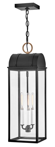 The Campbell 3-Light Large Hanging Lantern in Black is a stunning tribute to traditional colonial lanterns. Its carriage house styling, characterized by a bold arched roof and a cast top ring, seamlessly complements classic architectural designs. The black finish with burnished bronze accents adds a touch of sophistication and elegance, making it a versatile addition to any home.