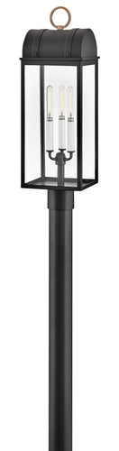 The Campbell 3-Light Large Post Lantern in Black is a stunning addition to any outdoor space, inspired by traditional colonial lanterns. Its carriage house styling is a nod to classic architecture, featuring a bold arched roof and a cast top ring that exudes timeless elegance. The lantern's sleek black finish with burnished bronze accents adds a touch of sophistication, making it a perfect fit for various outdoor themes and settings.