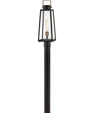 Enhance your outdoor spaces with the Hugh 1-Light Large Post Mount Lantern in Black. This beautifully crafted lantern boasts a sleek, transitional style that effortlessly complements any exterior décor. Its trapezoidal design features bold, over-scaled clear glass panes paired with a robust metal frame, injecting a modern edge into your alfresco area. The black finish adds a touch of sophistication, making it a perfect fit for contemporary and classic settings alike.