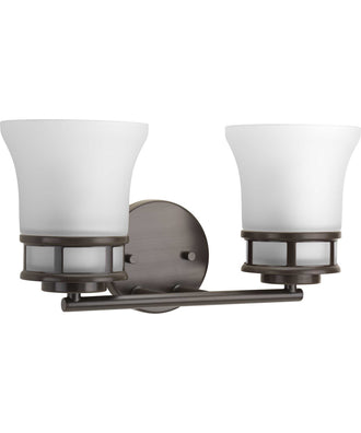 Ideal for a bathroom and powder room. Perfect for coastal, craftsman, modern, and modern craftsman style settings. Handsome antique bronze finish. Elegant etched glass shades. Mount the light fixture facing up or down. Use 2 medium base bulbs that are sold separately (100 W max - LED/CFL/incandescent). compatible with dimmable bulbs. Measures 16-inch width by 8-inch height by 6.5-inch (extends from wall). Certifications: UL-CUL Damp Location Listed. Pairs with the Ratio and Tally collections by Progress Lighting. Our 1-year Limited Warranty guarantees your complete satisfaction with your purchase and includes professional after-sales customer service support.