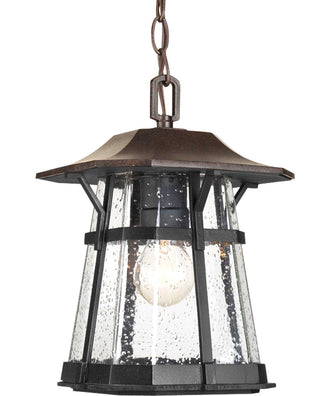 One-light hanging lantern from the Derby collection boasts a combination of Espresso and textured black powder coated finishes. The seeded glass diffuser is encased in the cast aluminum black from with the Espresso finish on the roof.