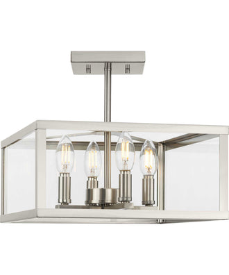The Hillcrest Semi-Flush Light interprets the traditional carriage light for the modern age, giving it a fresh update with a refined angular silhouette. A classic candelabra base is suspended within a clear beveled glass frame.Clear illumination is cast from its airy design.