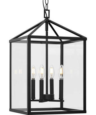 The Hillcrest 4-Light Transitional Hall & Foyer Light in Matte Black is a stunning reinterpretation of the traditional carriage light, updated for modern sensibilities. Its refined angular silhouette exudes sophistication and elegance, making it a perfect addition to any contemporary or transitional home decor. The fixture features a classic candelabra base suspended within a clear beveled glass frame, providing a timeless yet fresh look that enhances any space.