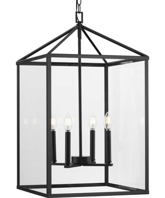 The light's updated classic silhouette is ideal for Transitional and Modern Farmhouse settings. Brings a distinct look to ceilings in halls, foyers, and kitchens. Its angular frame is finished in crisp matte black. Clear beveled glass panels surround a classic candelabra base. Foyer light is ideal for welcoming guests and visitors in an entryway. Measures 17-in. sq. by 29.75-in. height. Uses (4) 60-watt candelabra base bulbs or LED equivalent, that is sold separately, and dimmable when used in conjunction with a dimmable bulb. Includes 48 in. of chain for a variety of ceiling heights and can be used on a sloped ceiling. Warranty: Our 1-Year Limited Warranty guarantees your complete satisfaction with your purchase and includes professional after-sales customer service support. Includes installation instructions and mounting hardware for a quick, easy installation
