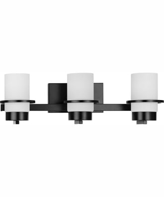 A sleek band accent adds a fresh sense of style to modern farmhouse and contemporary settings. The light's sophisticated frame complements the soft etched glass shade, bringing a modern appeal to bathrooms. The light is finished in soft matte black, accenting the light's polished design. Cylindrical etched glass shades deliver glowing illumination, offering the ideal amount of task lighting. This versatile fixture can be mounted with shades facing up or down. Measures 22.75 in. length by 7 in. height, extends 5.75 in. Use (3) 100-Watt maximum medium base bulbs, or LED equivalent, that is sold separately and dimmable when used in conjunction with dimmable bulbs. Certifications: cULus Damp Location listed, fixture can be used in rooms such as bathrooms, powder rooms or covered outdoor rooms where moisture may be present. Warranty: Our 1-Year Limited Warranty guarantees your complete satisfaction with your purchase and includes professional after-sales customer service support. Includes installation instructions and mounting hardware for a quick, easy installation
