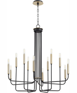 Transform your living space with the Hope 12-light Chandelier in Textured Black with Aged Brass by Quorum. This exquisite chandelier combines modern sophistication with a touch of classic elegance, making it a perfect centerpiece for any room. The chandelier features a striking design with twelve arms extending gracefully from a central column, each adorned with a sleek candelabra base. The contrasting finishes of textured black and aged brass create a visually stunning effect that complements a variety of interior styles.