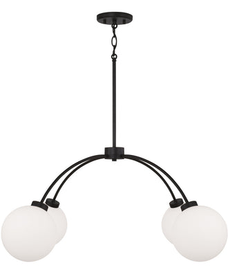 Bring modern curves and high contrast to any space with the Amos Medium Chandelier. This stunning piece is designed to elevate your interior decor with its sleek, contemporary style. The chandelier features four soft white glass globes that almost seem to float at the bottom of the gracefully curved arms, creating a sense of lightness and elegance. The black iron finish adds a subtle texture, enhancing the visual appeal and providing a striking contrast against the soft white glass.