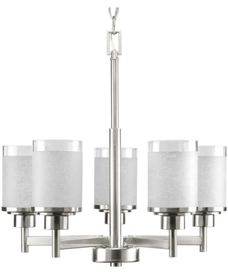 The Alexa 5-Light Etched Linen With Clear Edge Glass Modern Chandelier Light in Brushed Nickel is a stunning centerpiece that effortlessly combines elegance with contemporary design. The chandelier features a sleek brushed nickel frame, which adds a touch of sophistication to any room. The five lights are adorned with textured white linen glass shades, each complemented by a crisp clear edge accent, creating a visually appealing contrast.