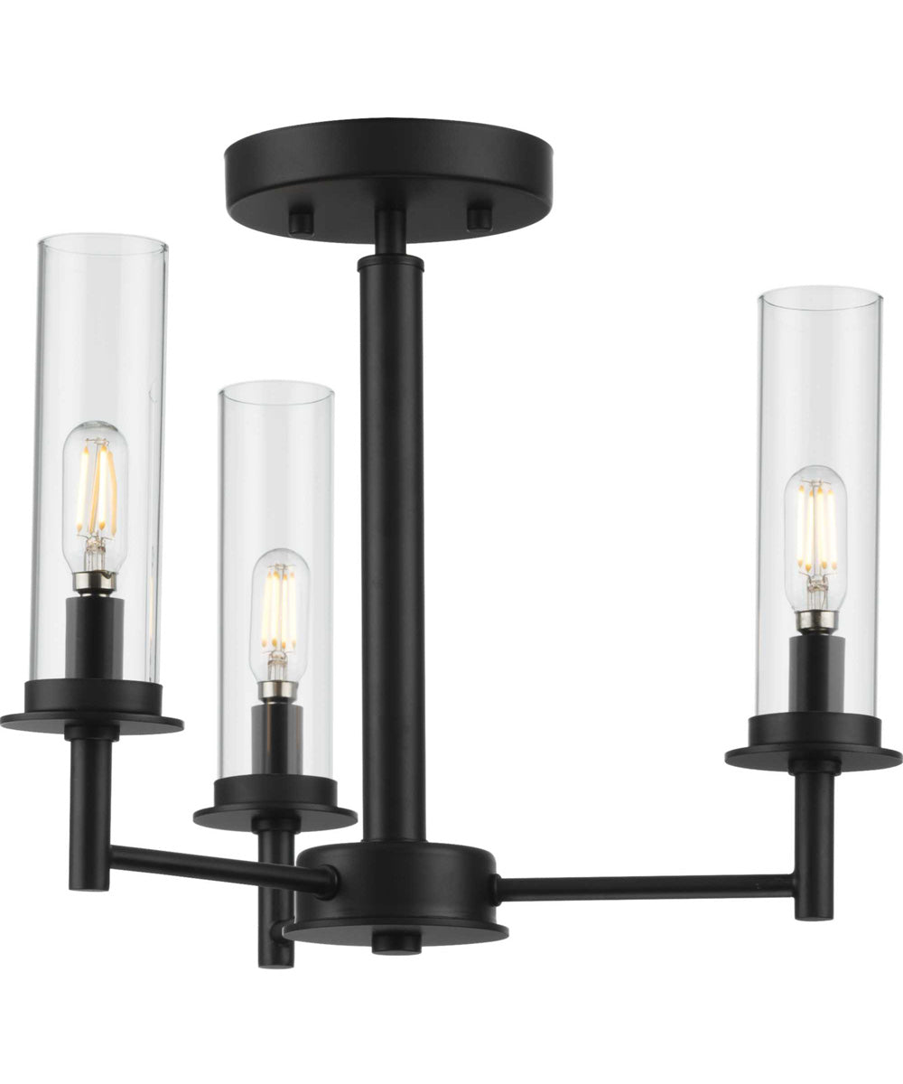 Application: Balance the best of modern and traditional with the Kellwyn Collection 3-Light Matte Black Clear Glass Transitional Semi-Flush Mount Convertible Ceiling Light ideal for any hallway, stairwell, entryway, breakfast nook, or sitting room. Styles: Perfect for contemporary, traditional, and transitional style settings. Finish: The classic frame with crisp, clean lines is coated in a beautiful matte black finish. Materials: Constructed from steel to ensure a long product lifespan. Can be installed as a ceiling mount or hung. Glass/Shades: Light sources glow from inside cylindrical glass shades that add a touch of luxury to the design. Bulbs: For ideal illumination, use 3 candelabra base bulbs that are sold separately (60w max - LED/CFL/incandescent). Compatible with dimmable bulbs. Dimensions: Measures 16-inch diameter by 12-5/8-inch height. Certifications: cULus dry location listed. Pairs With: Pairs with the Riley and Replay collections by Progress Lighting. Warranty: Our 1-Year Limited Warranty guarantees your complete satisfaction with your purchase and includes professional after-sales customer service support.