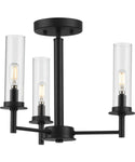 Balance the best of modern and traditional with the Kellwyn Collection 3-Light Matte Black Clear Glass Transitional Semi-Flush Mount Convertible Ceiling Light. The classic frame with crisp, clean lines is coated in a beautiful matte black finish. Light sources glow from inside cylindrical glass shades that add a touch of luxury to the design.