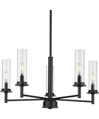 Application: Balance the best of modern and traditional with the Kellwyn Collection 5-Light Matte Black Clear Glass Transitional Chandelier Light ideal for any dining room, kitchen, bedroom, and living room. Styles: Perfect for contemporary, traditional, and transitional style settings. Finish: The classic frame with crisp, clean lines is coated in a beautiful matte black finish. Materials: Constructed from steel to ensure a long product lifespan. Glass/Shades: Light sources glow from inside cylindrical glass shades that add a touch of luxury to the design. Bulbs: For ideal illumination, use 5 candelabra base bulbs that are sold separately (60w max - LED/CFL/incandescent). Compatible with dimmable bulbs. Dimensions: Measures 23-inch diameter by 24-3/8-inch height. Certifications: cULus dry location listed. Pairs With: Pairs with the Riley and Replay collections by Progress Lighting. Warranty: Our 1-Year Limited Warranty guarantees your complete satisfaction with your purchase and includes professional after-sales customer service support.