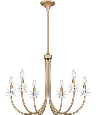 The Remy chandelier boasts a modern yet classic design that seamlessly blends with various interior styles. The bronze gold finish exudes a sense of luxury and warmth, making it an ideal centerpiece for any room. The six candelabra base bulbs, not included, are arranged in a symmetrical pattern, providing ample illumination while enhancing the chandelier's visual appeal. The white flower accents add a delicate and whimsical touch, creating a perfect balance between contemporary and traditional elements.