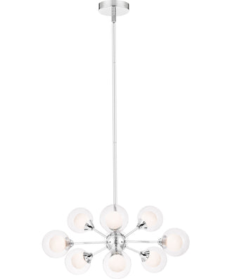 Find yourself mesmerized by the vintage beauty of the Spellbound 9-light Chandelier in Polished Chrome, a stunning member of Platinum by Quoizel. Inspired by the sputnik designs of decades past, this collection is truly retro reimagined. Spheres of shimmering ice glass are encased in outer shades of clear glass, resulting in a glittering display of light. The polished chrome arms and sockets add a contemporary edge to finish the look.