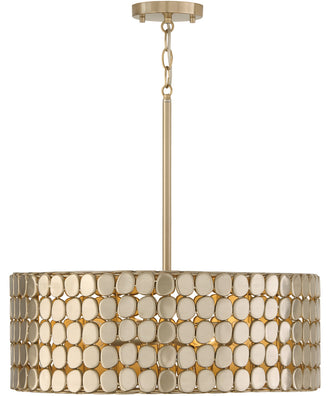 Invite captivating shimmer to any space with the Eliana 4-Light Pendant in Champagne Brass. This stunning light fixture, crafted in a classic drum silhouette, is designed to be the centerpiece of your room. The unique medallions that adorn the pendant alternate in catching the light, creating a mesmerizing play of illumination and shadow that teases glimpses of light from within.