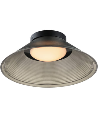 A tapered, ribbed glass shade adds a contemporary edge to a simple design. Available in Clear Ribbed glass with a plated Gold frame or in Emerald Green or Smoked glass with Matte Black frames. These retro-futuristic shades minimize peripheral glare, while a Matte White acrylic shallow domed diffuser softly disperses LED lighting, delivering ample illumination. The collection includes versatile pendant and flush mount options, with the latter doubling as a wall sconce.