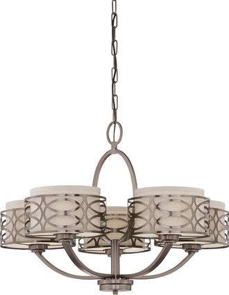 The 28"W Harlow 5-Light Chandelier in Hazel Bronze is a stunning addition to any home or office space. Its sophisticated design features five khaki fabric shades that are perfectly complemented by an intricate metal frame with a hazel bronze finish. This combination of materials and colors creates a timeless look that blends seamlessly with various interior styles, from traditional to contemporary.