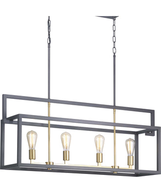 The Blakely collection four-light linear chandelier is a fashion-forward design style. A rectangular frame celebrates geometric interplay with clean, straight lines. Finished in Graphite with satin brass accents, the Blakely collection is ideal for Modern and Traditional interiors.
