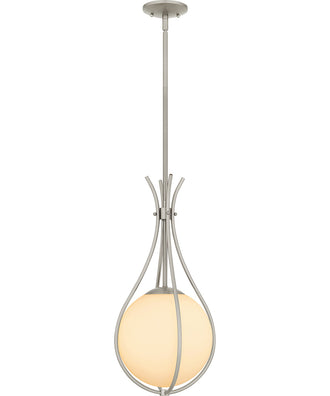 The Quoizel Pendant Small 1-light Mini Pendant in Brushed Nickel is a modern and playful addition to any space. It features a spherical, opal etched glass shade that pairs beautifully with sleek metallic lines. The frosted glass globe casts a soft, inviting glow, creating a warm and welcoming atmosphere in any room. The beautifully curving lines of the brushed nickel frame join together at the top, adding a touch of elegance and sophistication to the design.
