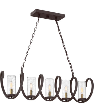 The Tumult 5-light Island Light in Western Bronze offers a sophisticated twist on traditional lighting. Its unique spiral shade design is both eye-catching and elegant, making it a perfect centerpiece for any room. The rich Western bronze finish adds a touch of warmth and luxury, while the clear seedy glass shades provide a subtle texture that enhances the overall aesthetic. This combination of materials and finishes creates a transitional style that seamlessly blends with various decor themes.