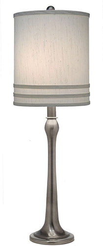 Introducing the 32"H 3-Way Table Lamp in Antique Nickel, a masterpiece from Stiffel that seamlessly combines elegance, functionality, and durability. This table lamp features a slender, gracefully curved body finished in a sophisticated antique nickel that exudes timeless charm. The sleek design is complemented by a striking Global White shade with horizontal trim, creating a perfect blend of classic and contemporary aesthetics.
