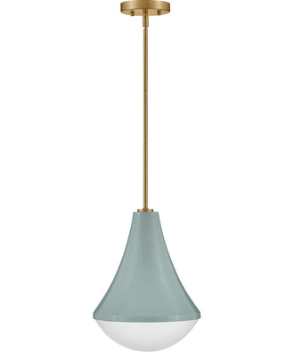 The Haddie 1-Light Small Pendant in Seafoam is a stunning addition to any space, offering a blend of elegance and modern design. Its unique, shapely profile is characterized by a sturdy structure rounded out with curved cased opal glass. The seafoam finish adds a touch of tranquility and sophistication, making it a versatile piece that complements various interior styles.