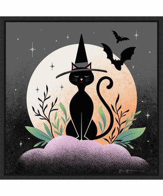 • CUSTOM CANVAS ARTWORK DETAILS: Hocus Pocus II by Gia Graham. DESCRIPTION: Whether your favorite part of Halloween is the spooky, the scary, or the childlike glee, this black cat in the moonlight celebrates the best parts of this holiday season. ARTIST BIO: Gia is a designer, illustrator, lettering artist, and Skillshare teacher. An island girl living in an urban world, her work merges these opposing aesthetics, resulting in modern design enlivened with lush florals, foliage, and color.