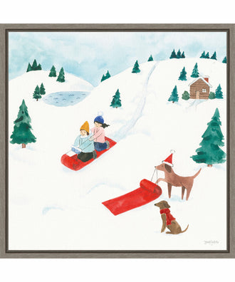 ART DESCRIPTION: This artwork features two playful dogs in a winter wonderland, surrounded by snow-covered trees and the joy of sledding with friends. This Amanti Art canvas art print was created by Jenaya Jackson and printed by Amanti Art in Madison WI. The canvas is stretched by hand and finished with a float frame. Individually made using traditional custom framing techniques, it has the quality you would expect from your local frame shop. Because of our attention to detail and focus on artistry, architects, interior designers, and homeowners alike choose this framed canvas artwork to create beautiful living spaces.