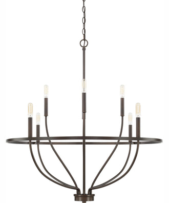 The Greyson 8-Light Chandelier in Bronze by Capital Lighting is a stunning addition to any home or office space. Its sleek, modern design features a sophisticated bronze finish that effortlessly blends with various interior styles. The chandelier's structure showcases a circular frame with gracefully curved arms, each holding a light, creating a balanced and symmetrical look. This piece is not just a lighting fixture but a statement of elegance and refined taste.