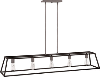 The 50"W Fulton 5-Light Chandelier in Aged Zinc is a masterpiece of minimalist beauty, embodying the timeless principle that 'less is more.' This striking chandelier features a vintage industrial style that seamlessly blends with modern aesthetics, making it a versatile addition to any home. Its clean, airy design is characterized by a tapered cage structure, constructed without glass, which adds an element of openness and sophistication to your space.