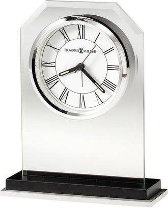 Rectangular beveled glass case with beveled corners sits on a black satin finished base with brushed aluminum base plate with polished sides. White dial with black Roman numerals; black hour and minute hands with luminous inserts; black seconds hand; silver alarm hand; and a glass crystal surrounded by a polished silver-tone bezel. Full felt bottom protects your table or desktop. Quartz, alarm movement includes one AA sized battery. Height 6.75" (17 cm) Width 5.5" (14 cm) Depth 2" (5 cm)