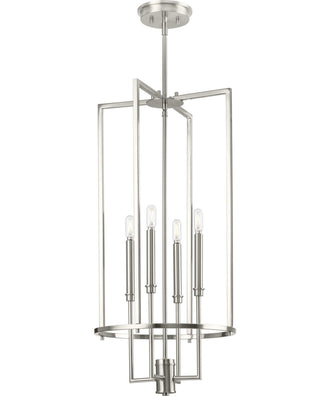 The Elara foyer light features a slender, chic form captured in an elongated frame, making it ideal for foyers, great rooms and kitchens. Its classically modern style is perfect for new traditional and transitional interiors. A beautiful brushed nickel finish enhances Elara's sophisticated design. The design features elements inspired by a chess pawn complement the classically modern style. An airy open frame showcases simple, elegant candelabra-style bases. Geometric styling lends visual impact ideal for open living spaces. Measures 31.37 in. height x 15 in. diameter x 15 in. length. Uses 4 60-Watt maximum candelabra base bulbs, or LED equivalent, that are sold separately. Fully dimmable when used with dimmable bulbs. Includes installation instructions and mounting hardware. Our 1-Year Limited Warranty guarantees your complete satisfaction with your purchase and includes professional after-sales customer service support
