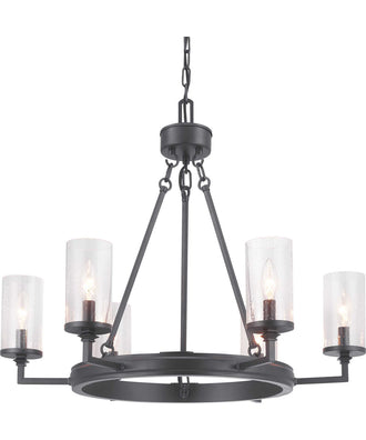 Graphite finishes and organic seeded-glass shades form the basis of this collection that channels traditional iron structures. This round six-light chandelier is ideal for a small-to-medium dining room or breakfast nook. This fixture feels most at home in a traditional or farmhouse-style setting. With hand-forged details, the dark graphite base and seeded-glass shades make this chandelier a dramatic focal point. Measures 28in diameter x 22 1/2in ht. Uses six, 60-watt max. candelabra base bulbs including LED equivalent (sold separately). Compatible with standard wall dimmer. Progress Lighting products are designed for exceptional quality, reliability, and functionality. Includes installation instructions and mounting hardware. Coordinating fixtures available