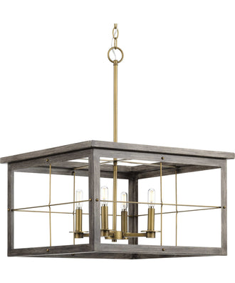 Experience the perfect blend of farmhouse character and urban sophistication with the Hedgerow Collection 4-Light Grey Washed Oak Farmhouse Chandelier Light. The softly textured, artistic faux wood frame showcasing a classic windowpane design is coated in an aged oak finish with beautiful distressed brass accents that elevates the typically farmhouse aesthetic. The light sources peek through the windowpane design for an overall lighter look and feel.