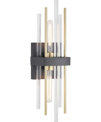 Suitable for sleek and sophisticated interiors, the Orrizo Collection's two-light wall bracket presents an artful arrangement of clear glass and golden metal rods that adorn a Black band. Geometric and artisan design influences complement both Modern and Luxe settings. Common applications for these statement-making fixtures include dining rooms and bedrooms and foyers.