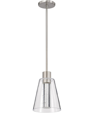 A fusion of contemporary style and classic allure, the exquisite Aura 62-2191 LED small pendant, is elegantly crafted for today's style. A dance of light awaits with integrated LED shining through a K9 bubble crystal column, inviting you to enjoy its warmth and glow through the clear glass shade. Featuring the latest in LED technology, the fixture comes in 3000K soft white light. The lustrous brushed nickel, effortlessly compliments the clear glass shade, working well with existing finishes, and decor. Picture your space transformed with beautiful simplicity, the latest technology, and design that is a celebration of here and now with Aura.