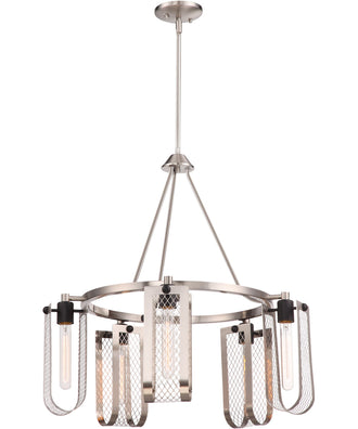 The 27"W Bandit 5-Light Chandelier in Brushed Nickel with Black Accents is a stunning addition to any home or office space. This exquisite chandelier features a modern design that combines sleek brushed nickel with bold black accents, creating a striking visual contrast. The chandelier's unique shape includes five elegantly curved arms that hold the lights, each encased in a stylish mesh design. This blend of contemporary and industrial elements makes it a versatile piece that can complement various interior styles, from modern and minimalist to urban and industrial.