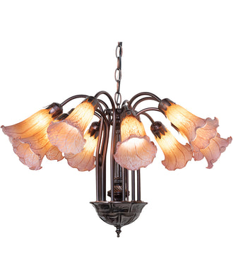 The 24" Wide Amber/Purple Tiffany Pond Lily 12 Light Chandelier is a stunning piece that embodies the timeless elegance of Louis Comfort Tiffany's famous Favrile design from the early 1900s. This chandelier features twelve beautifully crafted lily-shaped shades, each mouth-blown from fine art glass, creating a delicate and attractive design. The shades exhibit a captivating blend of amber and purple hues, which add a touch of sophistication and charm to any space. The gracefully curved arms of the chandelier are finished by hand in a rich Mahogany Bronze, enhancing its vintage appeal and making it a perfect centerpiece for any room.