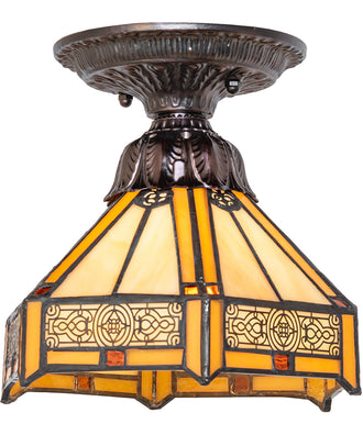 The Peaches Flushmount features Honey-colored stained glass strips accenting the Beige panels of this hexagonal-shaped shade; highlighted with Brass Filigree Accents on the skirt. The small square glass pieces in the center feature Sunburst and Amber accents. The shade is created using the famous Meyda Tiffany copperfoil construction process and complemented with elegant metal hardware finished in Mahogany Bronze. It is ideal for illuminating dining rooms and hallways in homes and hotels; from Macon; Savannah; Georgia; to Sacramento; California. The Peaches Flushmount is included in the American-designed; handcrafted Stained Glass Lighting Collection. UL and cUL listed for dry and damp locations. Each shade is a unique work of art with color variations based on natural ingredients inherent in the glass.