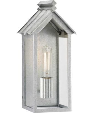 The Dunemere wall lantern complements a range of relaxed, outdoor living spaces from coast to coast. Finished in a classic galvanized finish, creating a timeless look for its iconic, barn-like silhouette.  Vintage barn details of symmetrical gables and a slanted corrugated roof form a peaked canopy over a rectangular, enclosed frame. Crisp light glows through clear glass lantern panels. Ribbed lamp holders inside the frame offer a contemporary design element to the barn-like silhouette. Measures 16.65 in. W x 14 in. H, extends 5.875 in. Uses 1 60-Watt maximum medium base bulbs, or LED equivalent, that are sold separately. Certifications: cETLus Wet Location Listed is suitable for any environment, this truly versatile piece is weather resistant and can be placed outside or inside for a trend-setting look. Constructed of corrosion-resistant DURASHIELD, engineered composite polymers that withstands a broad range of environmental conditions, delivering beautiful lighting and reliability. Includes installation instructions and mounting hardware