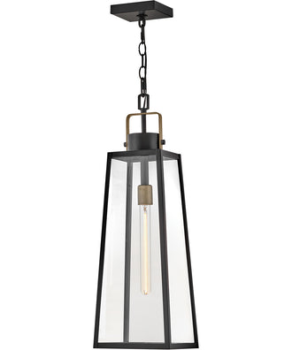 Elevate your outdoor or indoor space with the Hugh 1-Light Large Hanging Lantern in Black. This exquisite lantern features a sleek, trapezoidal design that seamlessly blends transitional style with modern aesthetics. The bold metal frame is finished in a sophisticated black, providing a striking contrast to the over-scaled clear glass panes. This combination creates a visually appealing piece that adds a touch of elegance and contemporary flair to any setting.