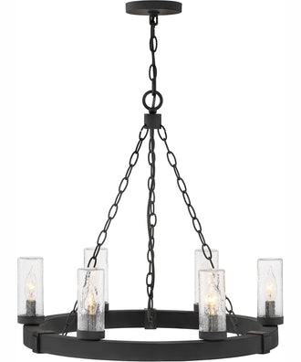 The Sawyer chandelier features a circular frame that supports six lights, each encased in a clear glass shade. The glass shades are subtly textured, adding a touch of vintage charm to the overall design. The chandelier's black finish enhances its contemporary appeal, making it a versatile piece that can complement a wide range of decor themes, from industrial to minimalist to rustic.