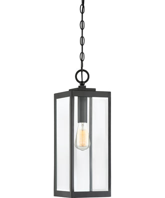 The Westover Large 1-light Outdoor Pendant Light in Earth Black is the epitome of contemporary elegance. Its clean lines and hand-riveted accents create a modern industrialist's dream, seamlessly blending sophistication with rugged charm. The long rectangular framework, adorned with clear glass panels, offers an unobstructed view of the lantern's sleek interior, highlighting its minimalist design.