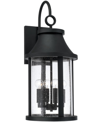 The Bridger 4-Light Outdoor Wall Lantern in Black is a stunning addition to any outdoor space, combining timeless elegance with modern functionality. The lantern's circular form and clear seeded glass create a visually appealing design that enhances the aesthetic of your exterior. The curved cap lines and ring detail on top add a touch of sophistication, making this lantern a standout piece.