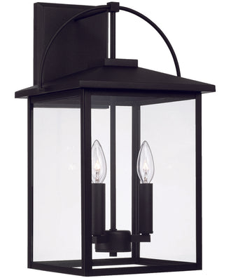 Featuring a bold black finish, the Bryson Wall Lantern exudes sophistication and style. The lantern's design is highlighted by clear glass panes that beautifully encase the three candelabra-style lights, creating a warm and inviting glow. The arched top adds a touch of architectural interest, making it a standout piece that complements a variety of home exteriors.