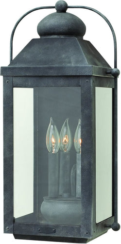 The 21" Anchorage 3-Light Outdoor Wall Light in Aged Zinc is a stunning addition to any exterior space. This wall light embodies an early American lantern design, meticulously crafted from solid aluminum to deliver a bold yet refined silhouette. The aged zinc finish exudes a timeless appeal, while the clear seedy glass adds a touch of vintage charm. Its elegant arched carriage handle and sturdy knobs enhance its classic charisma, making it a perfect fit for traditional and rustic décor themes.
