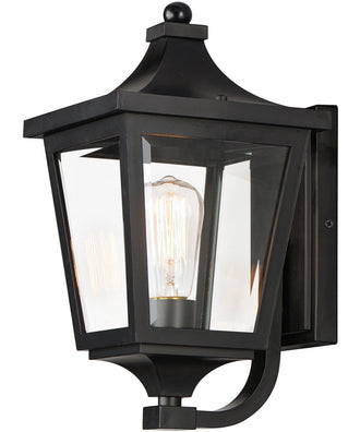The Sutton Place VX 1-Light Outdoor Sconce in Black is a stately addition to any home's exterior. This outdoor sconce draws inspiration from classic lantern shapes, offering a timeless design that effortlessly enhances the aesthetic of your outdoor spaces. The black finish provides a sleek and sophisticated look, while the clear glass shade allows for maximum light output, creating a warm and inviting atmosphere.
