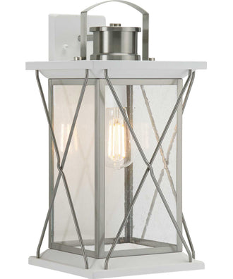 Transform you home into a warm and cozy dream with the friendly farmhouse-style of this small wall lantern. A rustic X-brace design decorates each side of the charming lantern silhouette. Clear seeded glass panes add an extra pop of rustic personality. A stainless steel finish complemented with white accents adds warmth and character as the lantern infuses your home with gentle illumination.